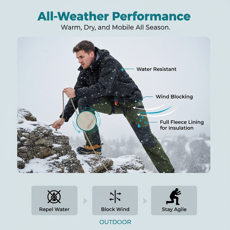 Featuring a water-resistant, wind-blocking shell with full fleece lining for freezing temps. Ripstop knee overlays add durability where you need it most, while stretch side panels ensure optimal movement.